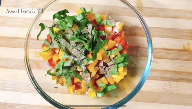 2. In a bowl add chopped kiwi, onion, tomatoes, Yello Bell Pepper, Fresh Basil.